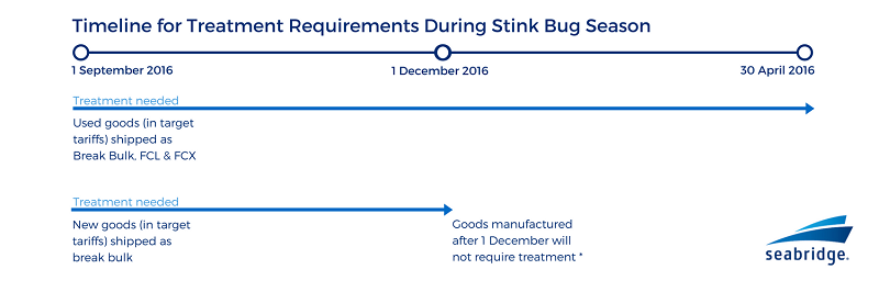 - Used goods – that are in the target tariffs and shipped as break bulk must be treated for potential stink bug infestations prior to shipment on or before 30 April 2017.
