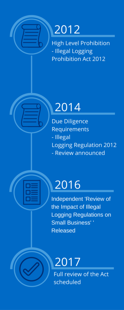 On 25 February 2016, the Australian Government published the final report of the ‘Independent review of the impact of the illegal logging regulations on small businesses’ and its related response. The review was conducted by independent consultant, KPMG, and evaluated whether the current due diligence requirements strike a suitable balance between the cost of compliance for small businesses and lowering the risk of illegally logged timber entering the Australian market.